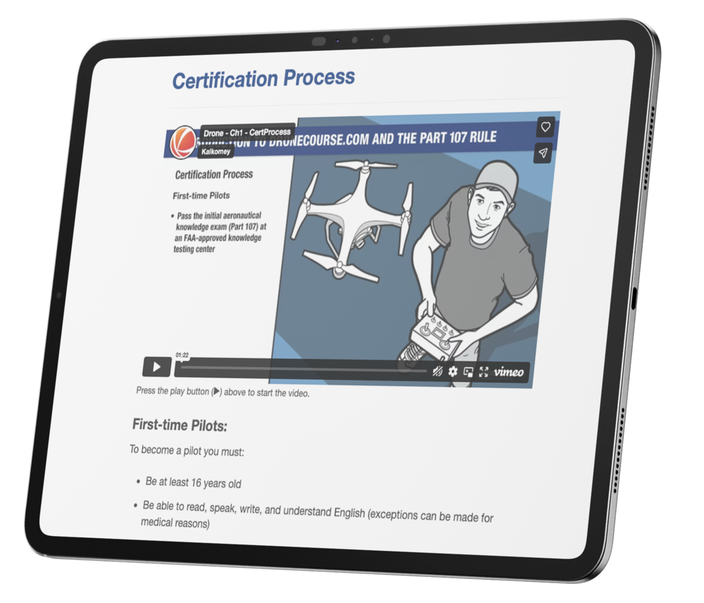 A. Our fully illustrated online drone training is broken down into chapters which includes an introduction to the process, an overview of current regulations, understanding airspace, exploring weather, operating your drone and decision making/emergency operations.